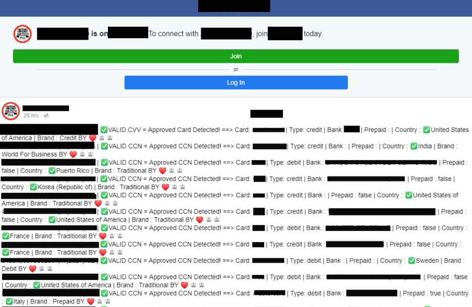 The example above shows a social media post exposing credit card information for individuals belonging to a global financial institution. Although threat actors traditionally used paste sites and the dark web to advertise stolen account data, social sites also are being used in similar fashion.