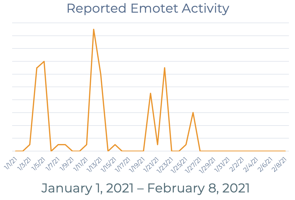 In 2021, we continue to see reports of Trickbot and ZLoader, as well as the dropper BazarLoader (often associated with Trickbot campaigns). BazarLoader was mostly absent during 2020, with activity first reported in Q4 of 2020. Emotet has been silent since operations were taken over January 26.