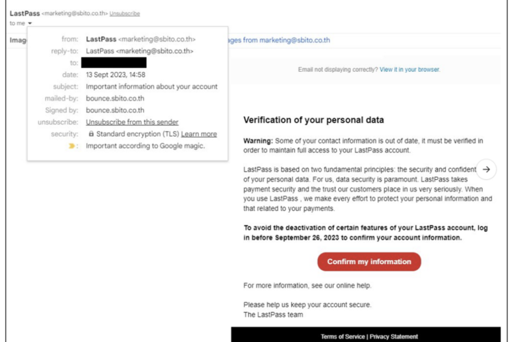 One of our Digital Risk Protection service customers, LastPass, is committed to monitoring the cyber threat environment to keep our customers as secure as possible. To highlight this commitment, we want to call attention to recent joint efforts to disrupt a phishing campaign targeting LastPass customers and associates that began two weeks ago. We are sharing this with you not because it is a new or unique threat, but to underscore the efforts we are taking to disrupt this threat and ones like it. On the morning of September 13th, LastPass customers began reporting a pervasive and convincing phishing campaign. The campaign had global reach and targeted a variety of sectors, including 87 of our own employees. The first reports we saw coming in from our customers arrived at approximately 9:34 am ET. The email originated from a sender address called “[email protected][.]th” and was associated with a domain that had not previously been linked to malicious activity targeting LastPass prior to that morning. The email also included a link to a phishing page hosted on subdomains of “customer-lastpass[.]su.” The campaign was widespread yet targeted enough to draw attention from the Information Security community, including a blog post calling out the emails from Malwarebytes published the following day. In an effort to protect our customers, this campaign became an immediate priority for LastPass and our domain monitoring and takedown vendor, Fortra’s PhishLabs, as soon as it was detected. Fig. 1: Example of Redacted Phishing Email from September 13, 2023